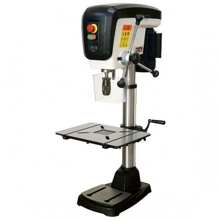 JET JDP-15B je stolná stĺpová vŕtačka špeciálne skonštruovaná pre prácu s drevom. Kľúčovými vlastnosťami tejto vŕtačky sú 80mm dlhé vŕtanie na jedno otočenie rukoväte a integrovaná hĺbková zarážka pre opakovanú presnosť vŕtania. Efektívne hnacie klinové remene poskytujú plynulý chod bez vibrácií s maximálnym prenosom výkonu motora na hriadeľ. K dispozícii je rýchly systém pre napínanie pásu bez použitia náradia, ktorý umožňuje jednoduchú zmenu rýchlosti otáčok. Horný ochranný kryt pásov je držaný magneticky a má bezpečnostný ochranný spínač. Stôl ponúka extra veľkú pracovnú plochu. Je vyrobený s obrobenej liatiny a pre ľahké upínanie je vybavený dvomi T-drážkami a stredovou výškovo nastaviteľnou vložkou. Presný stôl sa dá nakloniť o 45° na obe strany a tiež nastaviť tak, aby bola zaistená kolmosť stredovej osy skľučovadla. Výška stola sa dá nastaviť hladkým systémom cez ozubený pastorok, pričom ovládacia páka je oddelená od stola. Výkonný indukčný motor je pevne pripevnený ku konštrukcii, aby sa zabránilo ohybu a vibráciám. Jasné LED pracovné svetlo je zapustené do odliatku vretenníka a k dispozícii je tiež laserový navádzací kríž pre ľahké vyhľadanie vŕtaného stredu. Komplexný systém hĺbkového dorazu umožňuje presné vŕtanie slepých otvorov, ktoré je vždy presné. Tento stroj bol navrhnutý tak, aby spĺňal nároky každého spracovateľa dreva, s dostatočne veľkou pracovnou plochou, maximálnou hĺbkou vŕtania a masívnosťou konštrukcie. Hladký chod vretena, veľa unikátnych funkcií a detailov posúva túto stĺpovú vŕtačku na špičku pred konkurenciu.