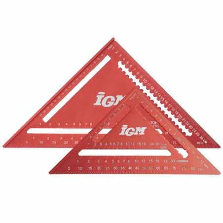 Presný duralový IGM Tesársky uholník je nutnosťou pre každého tesára. Robustný uholník má ľahko čitateľné, laserom vyznačené stupnice po 1 mm na oboch stranách. Kolmá strana má stupnicu do 175 / 300 mm so zárezmi po 5 mm, čo umožňuje rýchle pozdĺžne rysovanie rovnobežných čiar. Prepona má stupnicu od 0° do 90° a stupnicu pre tvorbu bežných krokiev, nárožných a úžľabných trámov. Je ideálny pre rýchle rysovanie čiar alebo ako vodidlo píly. Výrazne zjednodušuje stavbu strešnej konštrukcie.