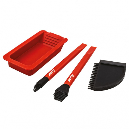 Stierka, vanička a nástavce štetcov sú vyrobené zo silikónu, ktorý zaručuje ľahké čistenie. Po dokončení práce nalejte prebytočné lepidlo pomocou priehlbiny na strane vaničky späť do nádoby. Tieto priehlbiny môžete tiež využiť ako opierku na štetce, aby ste si počas práce neznečistili pracovnú plochu. Zvyšky lepidla na štetcoch aj vo vaničke nechajte zaschnúť a následne ich jednoducho odlúpnite, prípadne všetko ihneď po práci umyte pod vlažnou vodou.