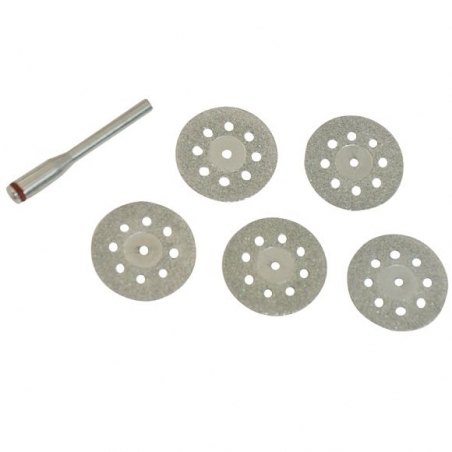 Sada obsahuje 5 ks diamantových perforovaných rezných kotúčov priemeru 22 mm s výmennou stopkou 3,2 mm. Vhodné pre rezanie a brúsenie materiálov tvrdších než kov, ako je mramor, kameň, porcelán, keramické a tvrdené živice. Zaručuje extrémnu precíznosť pri rezaní a dlhú životnosť. Kotúče sú určené iba na rezanie pozdĺž svojej hrany. Dbajte na svoju bezpečnosť a nevystavujte kotúče bočnému tlaku, nepokúšajte sa s nimi obrusovať alebo vyrezávať zakrivené otvory. Maximálne otáčky 28000 ot./min.