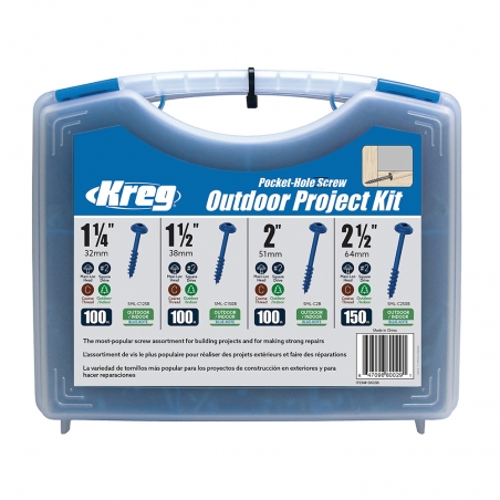 Vonkajšia súprava obsahuje štyri typy najpoužívanejších Kreg skrutiek pre skryté spoje, uložených v pevnom puzdre. Ideálne pre akékoľvek vonkajšie projekty.