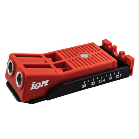 Zvŕtavací prípravok IGM pomôže vytvoriť pevný spoj drevených dielcov, napríklad pri montáži skriniek alebo iného nábytku. Prípravok slúži na vŕtanie otvorov pre skryté skrutkované spoje, s použitím vŕtačky ich vyvŕtate ľahko a rýchlo. Vŕtacie puzdro z tvrdenej ocele vedie HSS vrták s priemerom 9,5 mm do materiálu s hrúbkou 12 – 40 mm. Vďaka dvom puzdrám môžete vytvoriť ešte pevnejší spoj bez zbytočného presúvania. Pomocou stupnice zo spodu prípravku si ľahko nastavíte doraz, stačí len zmerať hrúbku materiálu. Vŕtacie puzdro potom posuniete podľa nameranej hrúbky. Puzdro drží pevne na mieste vďaka magnetu a zárezom v tele prípravku. Štvorhranným bitom Robertson č. 2 zaskrutkujete do vyvŕtaného otvoru Pocket Hole skrutky. Otočnú zarážku využijete pri vŕtaní o hranu dielca alebo pri spevňovaní už spojeného materiálu, napríklad pokosového spoja. Aby ste prípravok pri fixácii na dielec nemuseli zložito pridržiavať, je plochá horná časť vybavená magnetom, ku ktorému sa prichytí čeľusť Pocket Hole svorky.