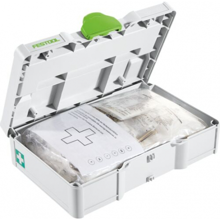 2 x trojhranná šatka DIN, 2 x jednorazové vinylové rukavice (pár), značka prvej pomoci ako nálepka 5 cm × 5 cm, nožnice na poskytnutie prvej pomoci 18 cm, 2 x ochrana dýchacích ciest, návod na prvú pomoc, 2 x fóliové vrecko, uzatvárateľné 30 × 40 cm, 4 x vlhčené utierky, rýchly chladiaci obklad, termoizolačná fólia 160 cm × 210 cm, šatka z netkanej textílie (5 kusov), resuscitačné rúško, pinzeta na triesky 8 cm, výplach očí Steri wash 5 × 20 ml, 2 x hliníkový obklad 8 × 10 cm, 14-dielna súprava náplastí pre kufor podľa DIN, náplasť 2,5 cm × 5 m, 2 x obklad na oko, 2 x fixačný obväz 6 cm × 4 m, 2 x fixačný obväz 8 cm × 4 m, balík obväzov malý, 3 x balík obväzov stredný, balík obväzov veľký, obväzová šatka 60 × 80 cm, 6 x obklad na rany 10 × 10 cm, Systainer³ SYS3 S 76, v kartónovom obale